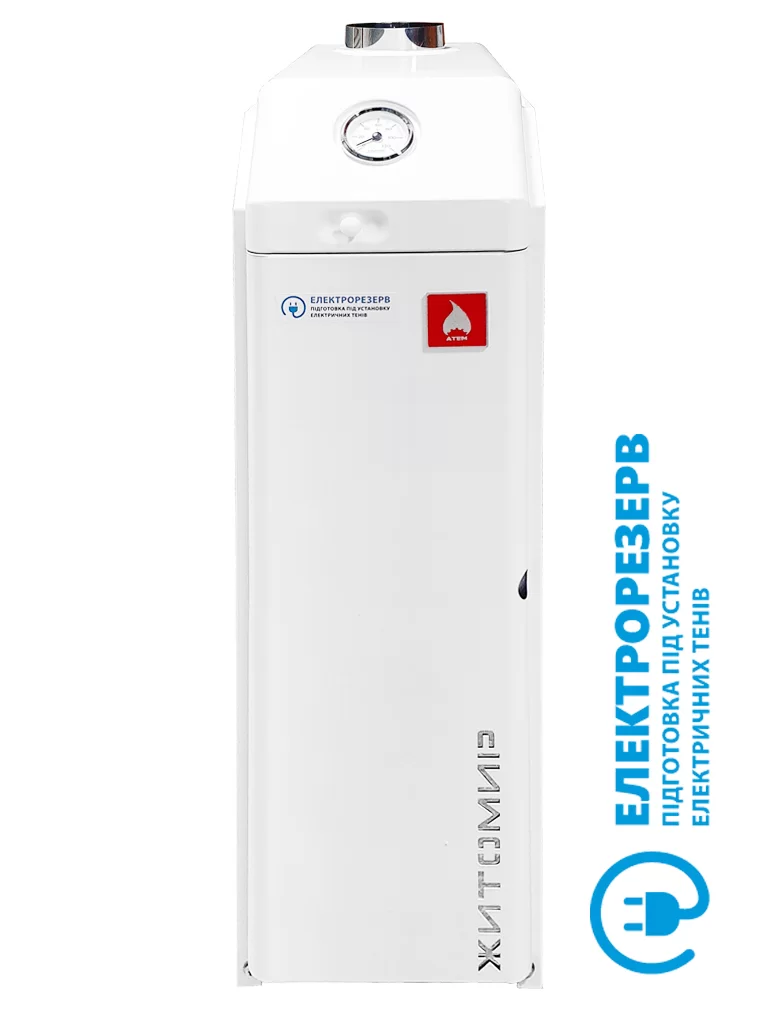 Кроме этого в котлах Житомир-3 задействованы фирменные конструкторские разработки, такие как автоматическая заслонка газохода, что уменьшает потери тепла, система помощи запуска котла «Атем-Старт» (модели 10-12 кВт), подготовка под установку электрических ТЭНов «Электрорезерв», и другие уникальные особенности, которые делают эти котлы лучшим выбором среди классических дымоходов котлов.