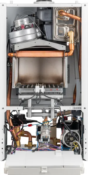 Ключевой элемент котла - это высокоэффективный теплообменник, изготовленный из чистой меди по технологии "Oxygen-Free", что обеспечивает его надежность. Конструкция также включает конденсационный экономайзер для увеличения тепловой эффективности и модулируемую горелку, поддерживающую широкий диапазон мощностей. Надежность и долговечность котла дополнительно гарантируются благодаря гидравлическому блоку, выполненному из качественной латуни.